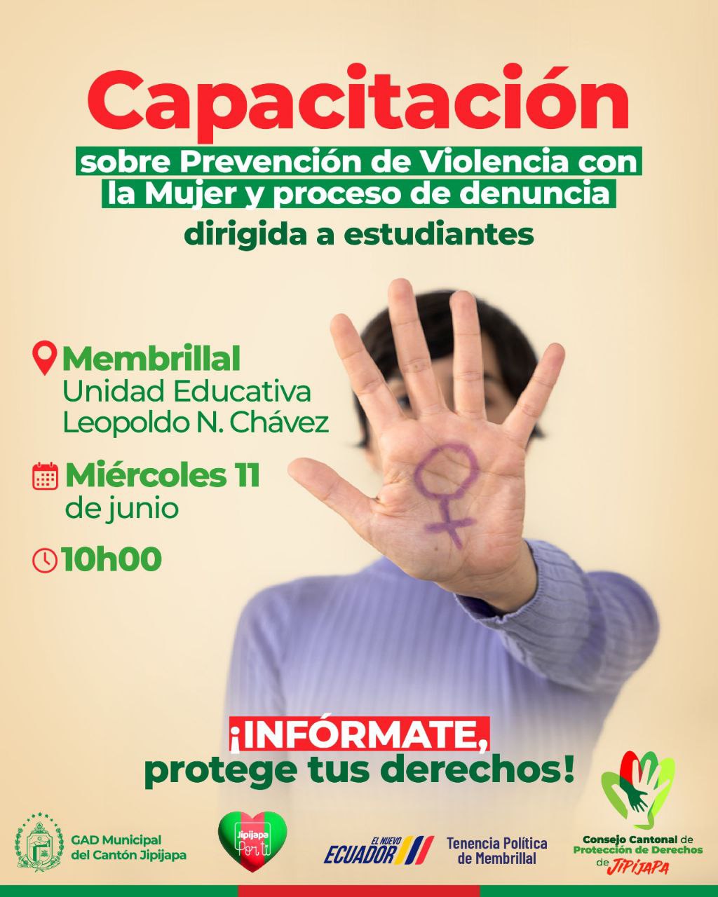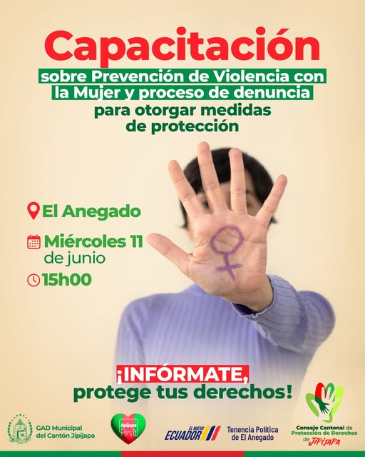 Capacitación sobre prevención de violencia contra la mujer y proceso de denuncia para obtener medidas de protección, organizada por el Consejo Cantonal de Protección de Derechos y la Tenencia Política de El Anegado y en la parroquia Membrillal.