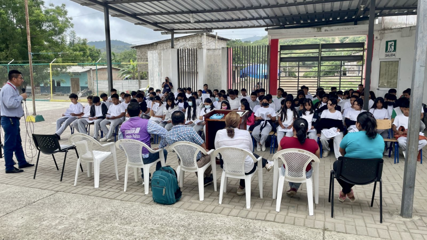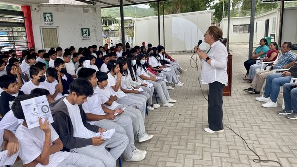 Estudiantes y docentes de la Unidad Educativa Leopoldo Chávez, en la parroquia Membrillal, participaron activamente en la capacitación que dictamos sobre la prevención de la violencia contra la mujer y la importancia de conocer los protocolos de denuncia.