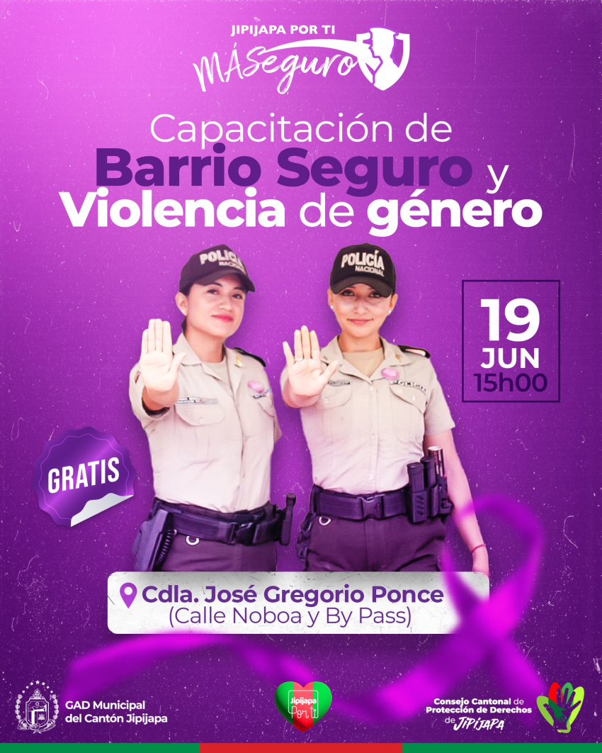 Este 19 de junio, acompáñanos en la capacitación gratuita sobre Barrio Seguro y prevención de violencia de género en la Cdla. José Gregorio Ponce. Tu voz, tu atención y tu compromiso pueden salvar vidas.