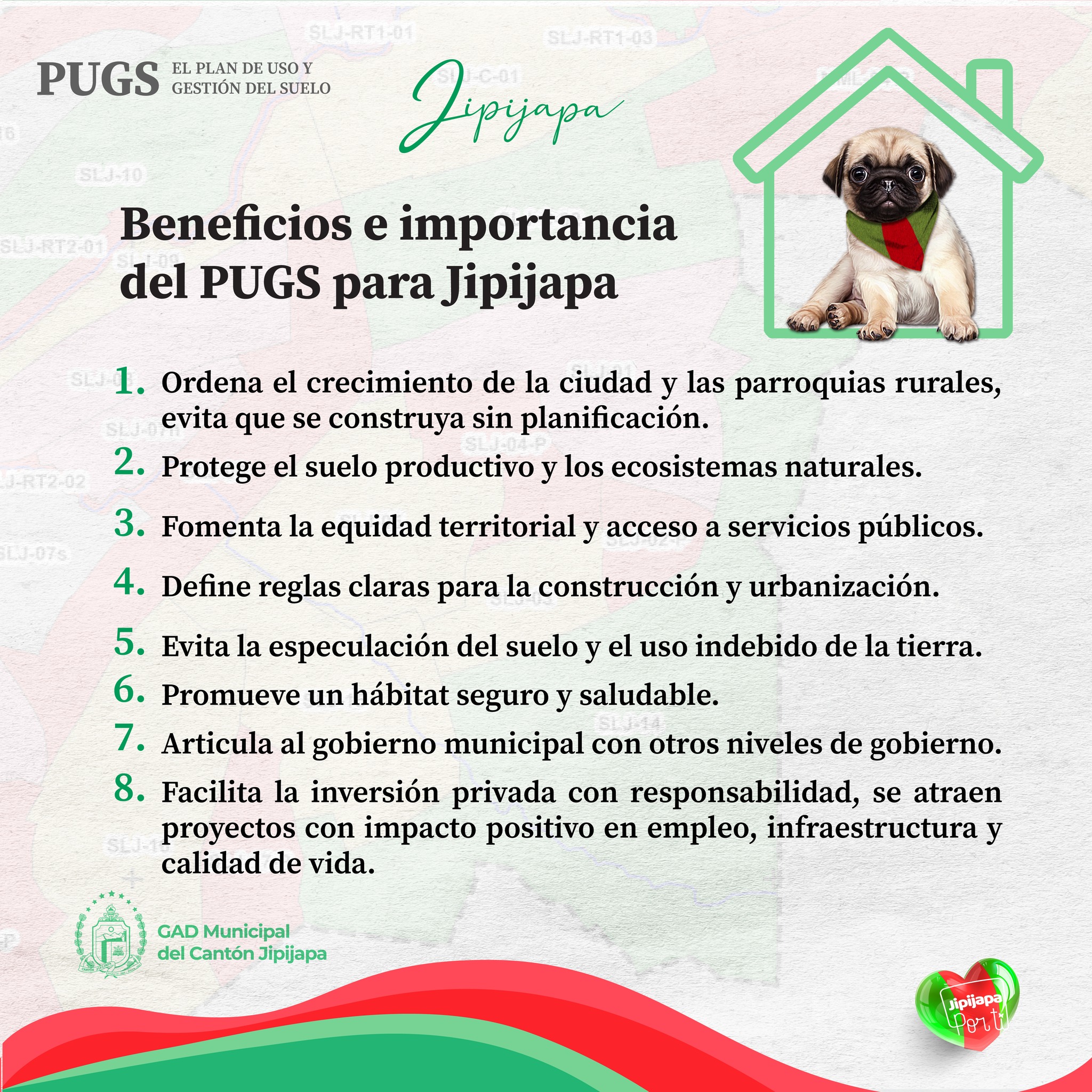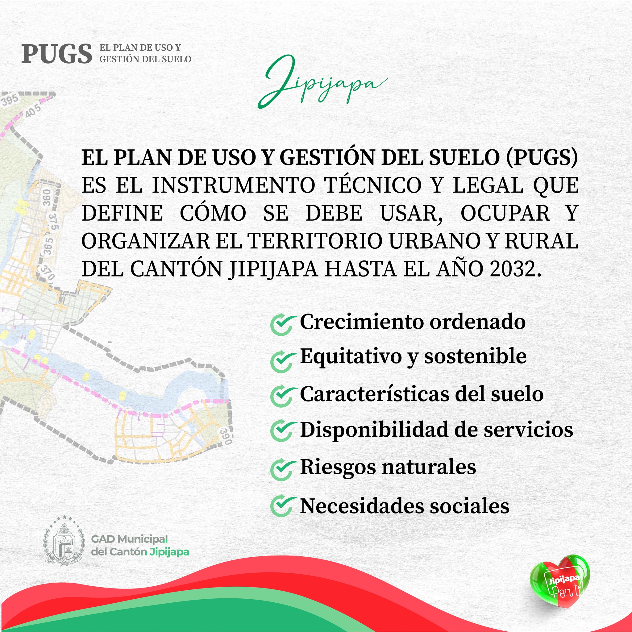 ¿Sabías qué es el PUGS? El Plan de Uso y Gestión del Suelo es una herramienta fundamental para ordenar el crecimiento de nuestra ciudad, proteger el ambiente y asegurar que Jipijapa se desarrolle de forma planificada, segura y sostenible.