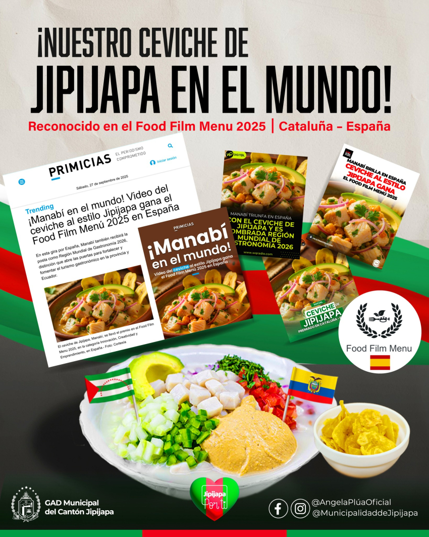 En la primera Cumbre Mundial de Gastronomía, celebrada en Cataluña, España, nuestro Ceviche de Jipijapa conquistó paladares y corazones, obteniendo el premio en la categoría Innovación, Creatividad y Emprendimiento en el Food Film Menu 2025.