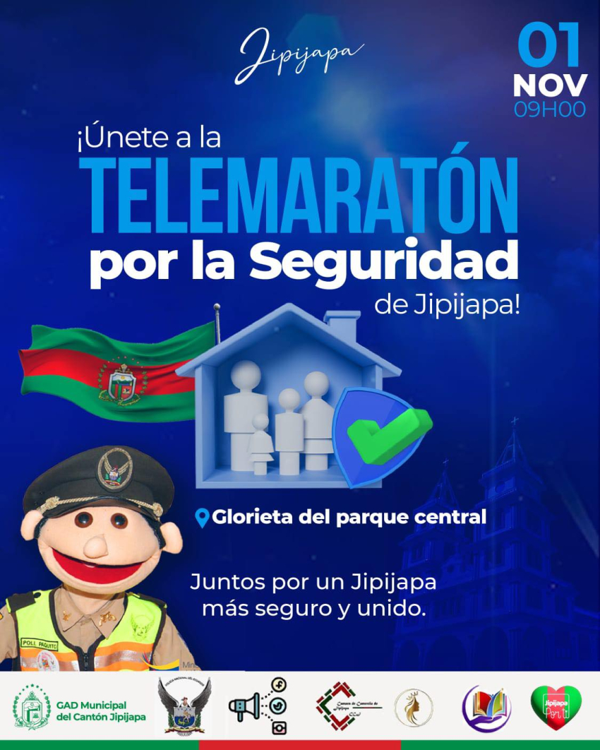La Alcaldía de Jipijapa se une a la Cámara de Comercio de Jipijapa en apoyo a la Telemaratón por la Seguridad de nuestro cantón, un evento solidario que se realizará este viernes 01 de noviembre desde las 09h00 en la Glorieta del Parque Central.