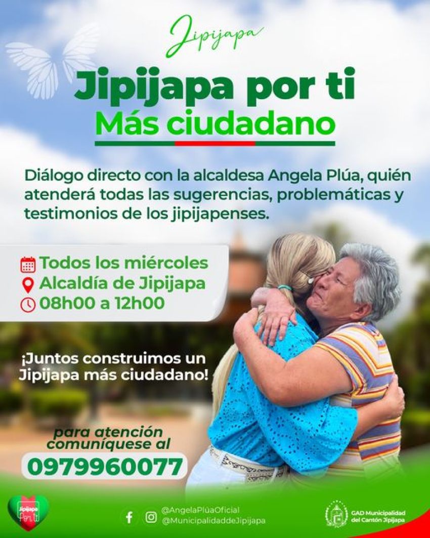 Todos los miércoles, la alcaldesa Ángela Plúa escuchará tus sugerencias, resolver problemáticas y recibir tus testimonios. ¡Construyamos juntos un Jipijapa más participativo y cercano! Comunícate al 0979960077 para más información.